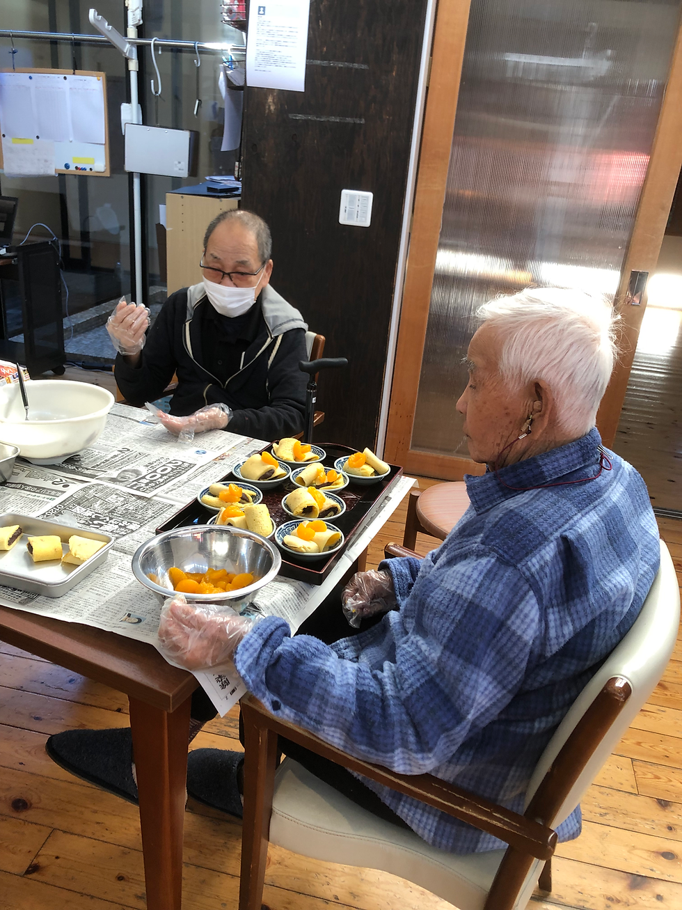 皆さんと一緒に『昔の遊び』の話をしながら、おやつ作りと紙芝居をしました。あんこを巻いてフルーツをのせて完成です!「甘くて美味しいね」😋