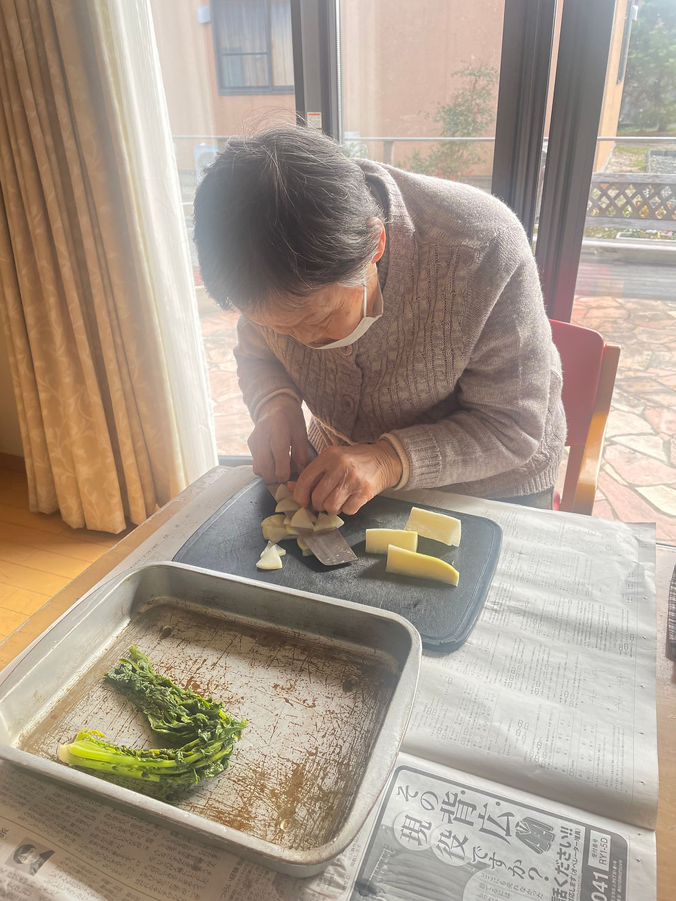 そして、海鮮丼に合わる副菜は、デイで穫れたほうれん草を使った和え物や大根のどぼ漬け(ぬか漬け)を皆さんと一緒に作って盛り付け、食べました。